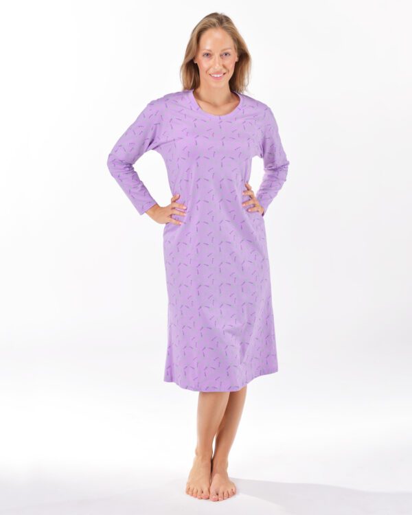 košieľka nočná dámska dlhý rukáv, šitá, tlac značky GINA, kód 19173. Zloženie 100% BavlnaZákladem kvalitního spánku je vaše pohodlí, ke kterému vám pomůže i pohodlné noční prádlo. Naše dámská noční košilka s dlouhým rukávem je ideální volbou pro každou milovnici volných střihů a kvalitních materiálů. Noční košilka je dlouhá, zdobí ji potisk s levandulemi, nikde neškrtí. Materiál ze 100% bavlny vám zajistí pohodlí po celou noc..
