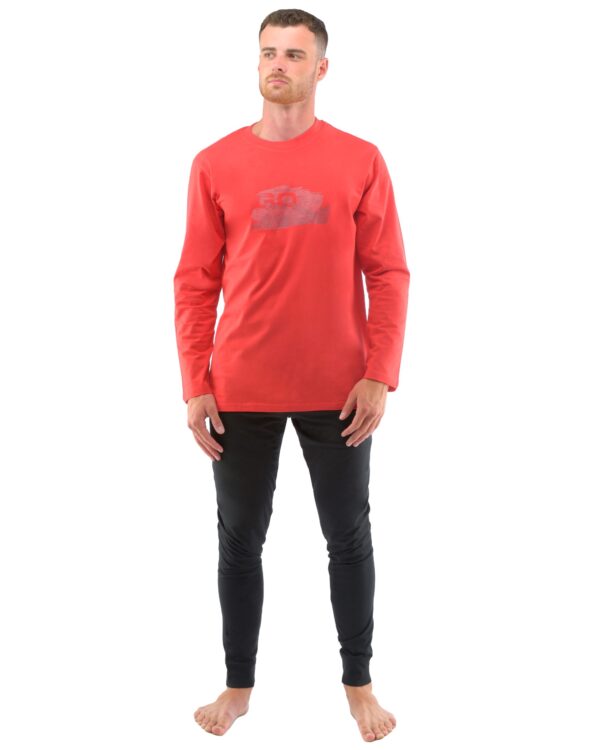 Tričko s dlhým rukávom je ozdobené modernou potlačou na hrudi, ktorá decentne vyniká, zatiaľ čo dlhé jednofarebné nohavice sú zakončené elegantnými manžetami. Všetko je vyrobené zo 100 % bavlneného úpletu, ktorý je výnimočne hebký, mäkký a šetrný k pokožke. Priedušnosť a schopnosť odvádzať vlhkosť zaručujú pohodlie po celú noc, čo oceníte najmä po náročnom dni. Pyžamo je ideálne pre náročných mužov, ktorí od domáceho oblečenia očakávajú viac než len funkčnosť – v tomto modeli budete vyzerať dokonale aj počas spánku. Zažijete pocit, akoby ste boli v objatí mäkkej bavlnky.