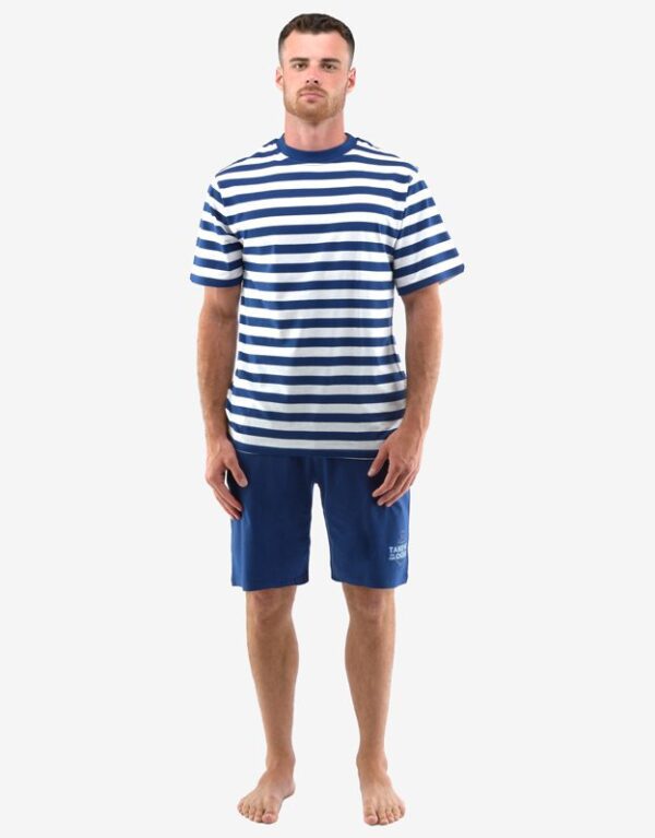 Užite si kvalitný spánok aj domácu pohodu s týmto pánskym pyžamom s krátkymi nohavicami a krátkym rukávom. Ideálny variant pre teplejšie mesiace alebo ako pohodlné domáce oblečenie. Tričko upúta oči moderným, vyplietacím pruhovaným vzorom, zatiaľ čo jednofarebné kraťasy s decentnou potlačou na ľavej nohavici ponúkajú uvoľnený look. Materiál zo 100 % bavlny vám poskytne dokonalé pohodlie, priedušnosť a jemnosť, vďaka čomu sa budete cítiť ako v bavlnke po celý deň i noc. Voľný a pohodlný strih praje neobmedzenej pohode a pohybu. Súčasť kolekcie Pyžamá 2022 vám prináša tradičný dizajn v modernom šate pre mužov, ktorí si začínajú dôležitosť oddychu a vlastného štýlu.