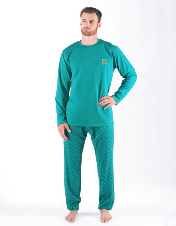 Klasické pánske dlhé pyžamo s telu príjemným strihom a vyrobené z jemného bavlneného úpletu je zárukou pohodlia na celý deň a noc. Kalhoty s elegantným vzorom ladia s tričkom s dlhými rukávmi, ktoré má decentnú potlač na hrudi. Kompletné zloženie z 100 % bavlny zaručuje, že materiál je hypoalergénny, priedušný a vhodný aj pre citlivú pokožku. Tento univerzálny kúsok nosenia vám dodá pocit uvoľnenia i sebavedomého štýlu zároveň. Kolekcia: Pyžamá 2024 ⭐