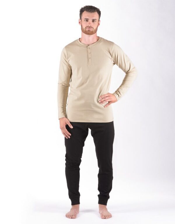 Zabudnite na kompromisy počas nočných hodín a zažite maximálne pohodlie s týmto elegantným pánskym pyžamom! Vrch je vybavený praktickou rozhalenku s tromi decentnými gombíkmi a dlhými rukávmi, ktoré vás zahrejú aj počas chladných večerov. Dlhé nohavice s manžetou na zakončení perfektne sedia, nevyhŕňajú sa a pohodlne držia tvar. Jednofarebný dizajn je nadčasový a podčiarkuje mužskú eleganciu, zatiaľ čo jemná bavlna (95 % v tričku, 100 % v nohaviciach) v kombinácii s elastanom (5 % v tričku) prináša príjemnú pružnosť a mimoriadne pohodlie pre každodenné nosenie. Prírodný úplet je vhodný aj pre citlivú pokožku, rýchlo odvádza vlhkosť a zachováva si stálosť tvaru i po mnohých praní. Ideálny set nielen na spánok, ale aj na domáce leňošenie. Vďaka tejto kvalite budete vyzerať sebavedome a cítiť sa výnimočne každý večer. Doprajte si pocit luxusu, ktorý si zaslúžite!