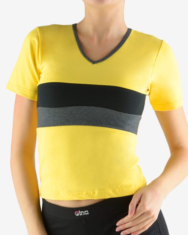 Dámske tričko s krátkym rukávom v pásovej dĺžke, príjemné na nosenie vďaka zloženiu 90 % bavlna a 10 % elastan Lycra, ktoré kombinuje prirodzenú hebkosť s potrebnou pružnosťou. Výstrih do V dopĺňajú viaceré farebné pruhy, ktoré vytvárajú dynamický a svieži vzhľad, ideálny na šport alebo ležérne nosenie. Materiál je šetrný k pokožke, poskytuje vysoký komfort aj pri dlhodobom nosení a zachováva si tvar aj po častom praní. Tento model je perfektnou voľbou pre aktívne ženy, ktoré hľadajú spojenie kvality, pohodlia a trendového dizajnu pre svoj každodenný štýl. Vďaka unikátnemu strihu a farebným detailom vyžaruje jemnú ženskosť a energiu.