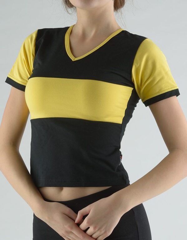 Tričko s krátkym rukávom do pása, vyrobené z prémiovej bavlny doplnenej o elastan Lycra (90 % bavlna, 10 % elastan). Tento materiál zaručuje prirodzenú priedušnosť, hebkosť na dotyk a skvelú pružnosť, ktorá sa prispôsobí vašej postave, pričom si zachováva svoj tvar aj po mnohých praniach. Výstrih do V zvýrazní ženský dekolt a nádych jemnej elegancie. Tričko je členité farebným pruhom s kontrastnými rukávmi, ktoré dodávajú moderný a dynamický štýl. Ideálne na každodenné nosenie, šport alebo voľný čas, keď chcete cítiť pohodlie a sebavedomie zároveň. Tento kúsok kombinuje kvalitu prírodných materiálov s funkčnými vlastnosťami elastanu, takže je nielen príjemný na tele, ale aj odolný a trvácny. Vystúpte z davu a doprajte si komfort, ktorý si zaslúžite.